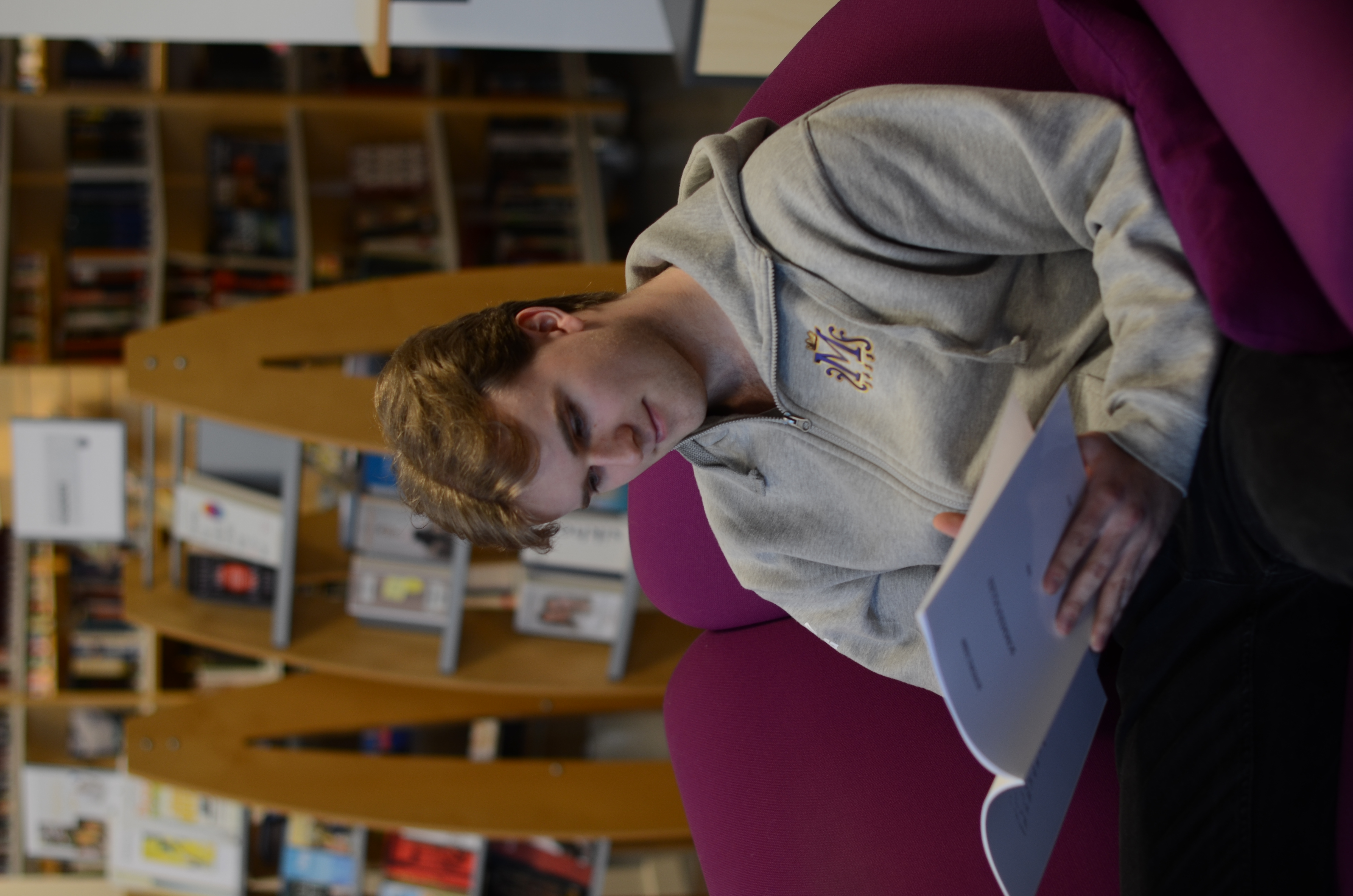 Me held til på sida av kantina. Stikk innom og sjå kva biblioteket kan tilby deg. Gjer deg litt kjent, gå på jakt i hyllene. Dersom du ikkje finn fram, så spør bibliotekarane. Det er viktig for skulegangen din å bruke ulike informasjonskjelder, ikkje berre Wikipedia.